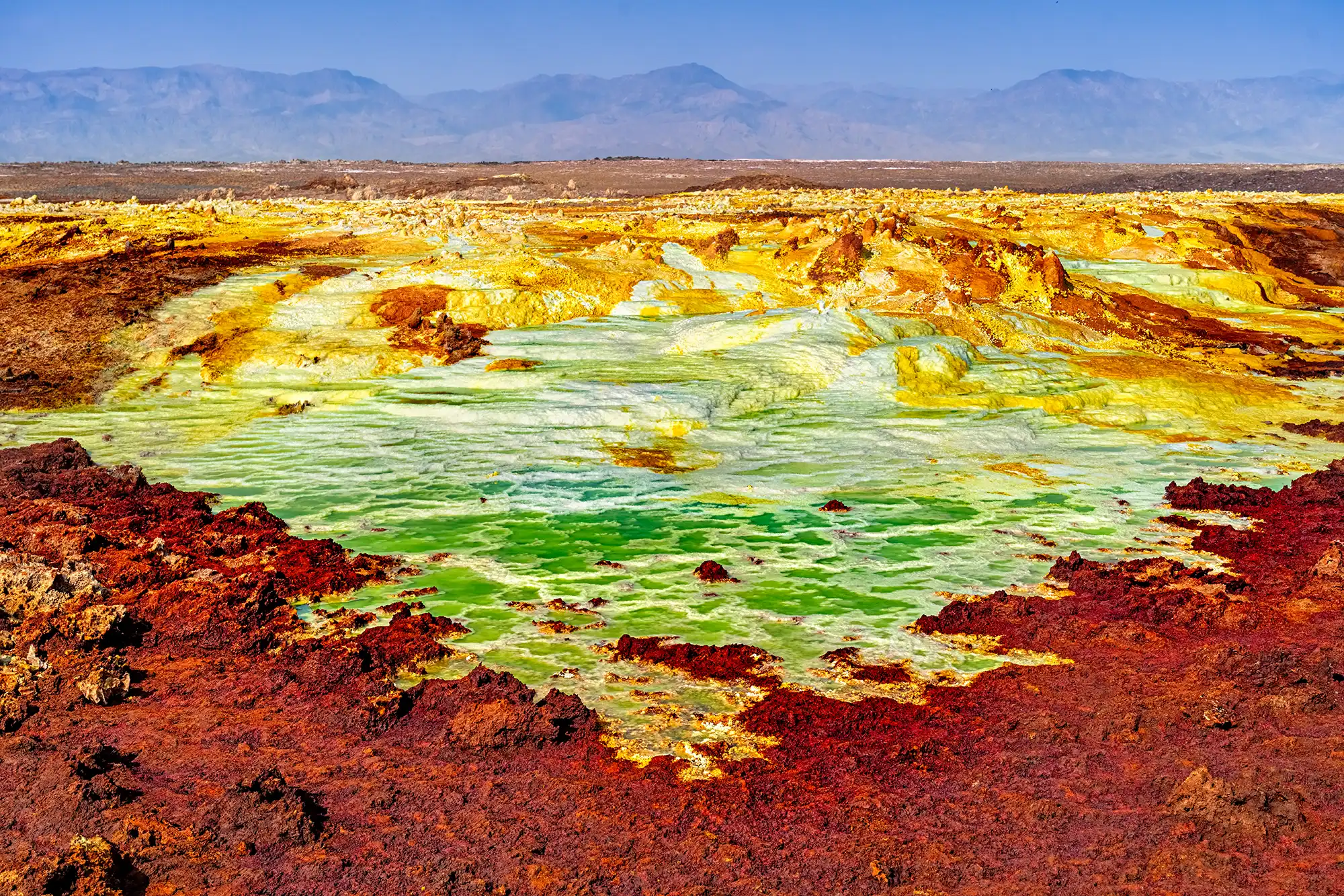 Die Danakilwüste in Äthiopien wirkt wie aus einer anderen Welt. Ihre surrealen Landschaften aus Schwefel, Salz und vulkanischen Mineralien schaffen eine Palette von Farben, die von Gelb über Grün bis hin zu Orange und Rot reicht – fließend, intensiv und fast unwirklich. Jede Ebene, jeder Krater, jeder glitzernde Salzsee lädt dazu ein, die Welt mit neuen Augen zu sehen.