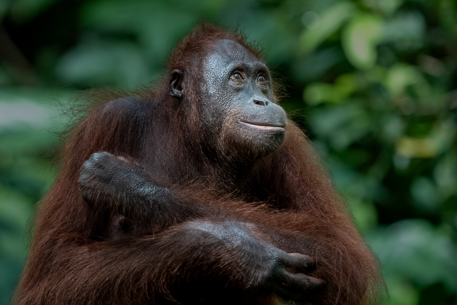 Inmitten des dampfenden Grüns von Borneo, dort, wo das Leben in Schichten aus Licht, Schatten und Atem wohnt, trat sie plötzlich hervor: Eine Orang-Utan-Mutter – still, würdevoll, mit einem kleinen Wesen an ihrer Brust, kaum vier Monate alt. Ein Bild aus Liebe. Ein Bild aus Ursprung. Ein Bild, das ich seit Jahren in mir trug.