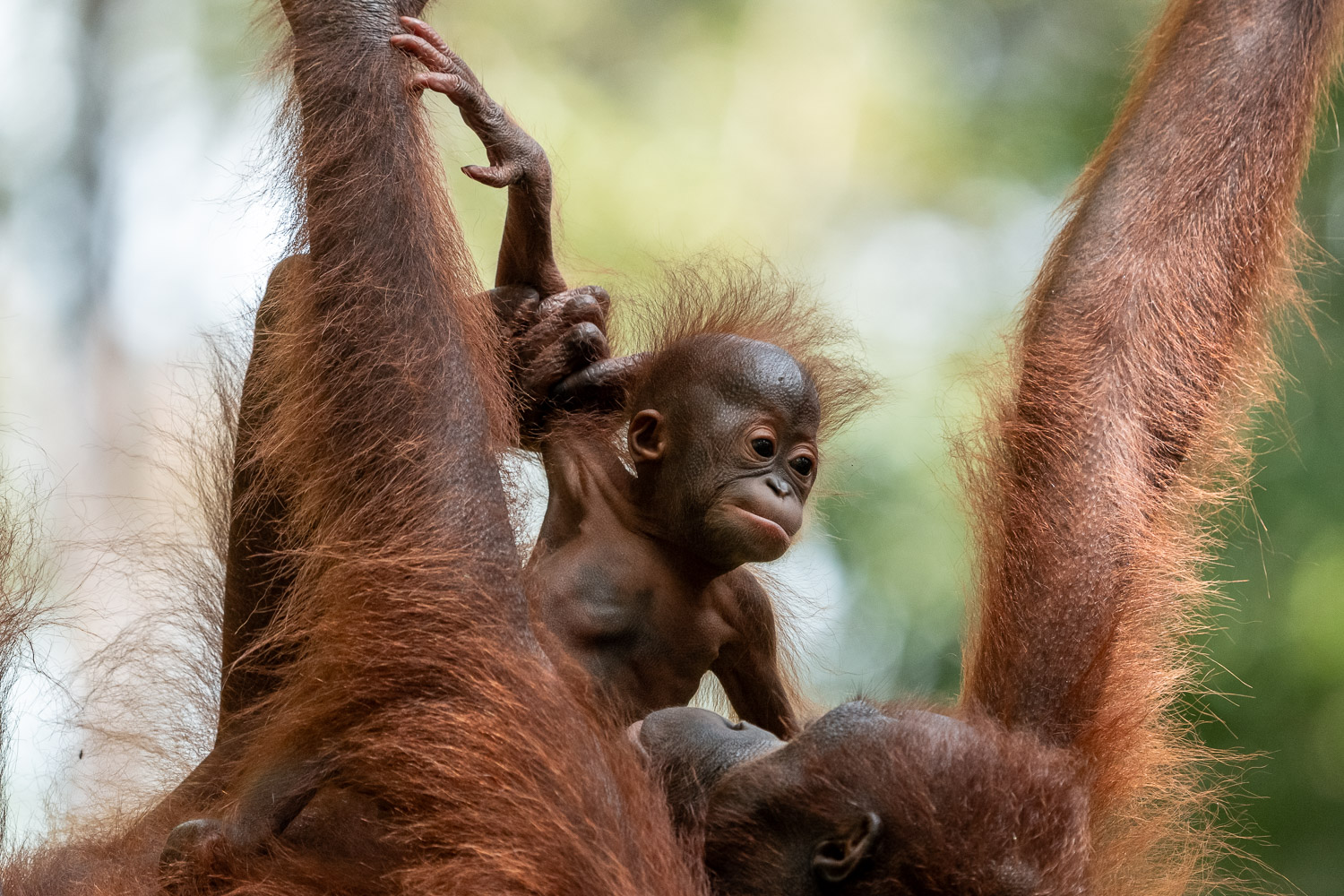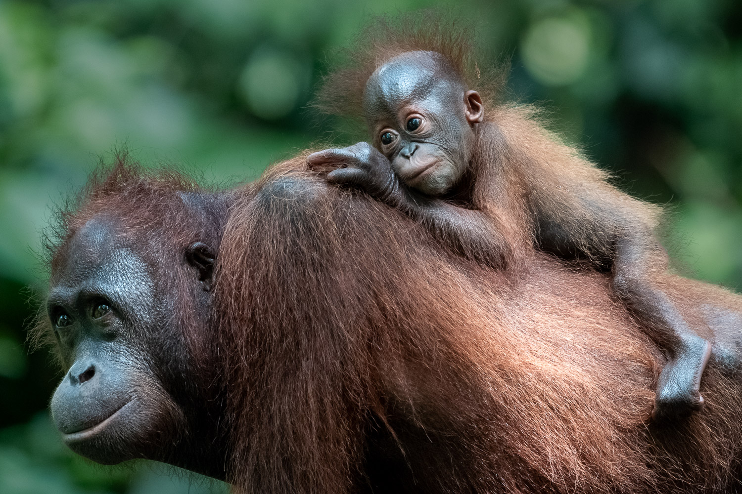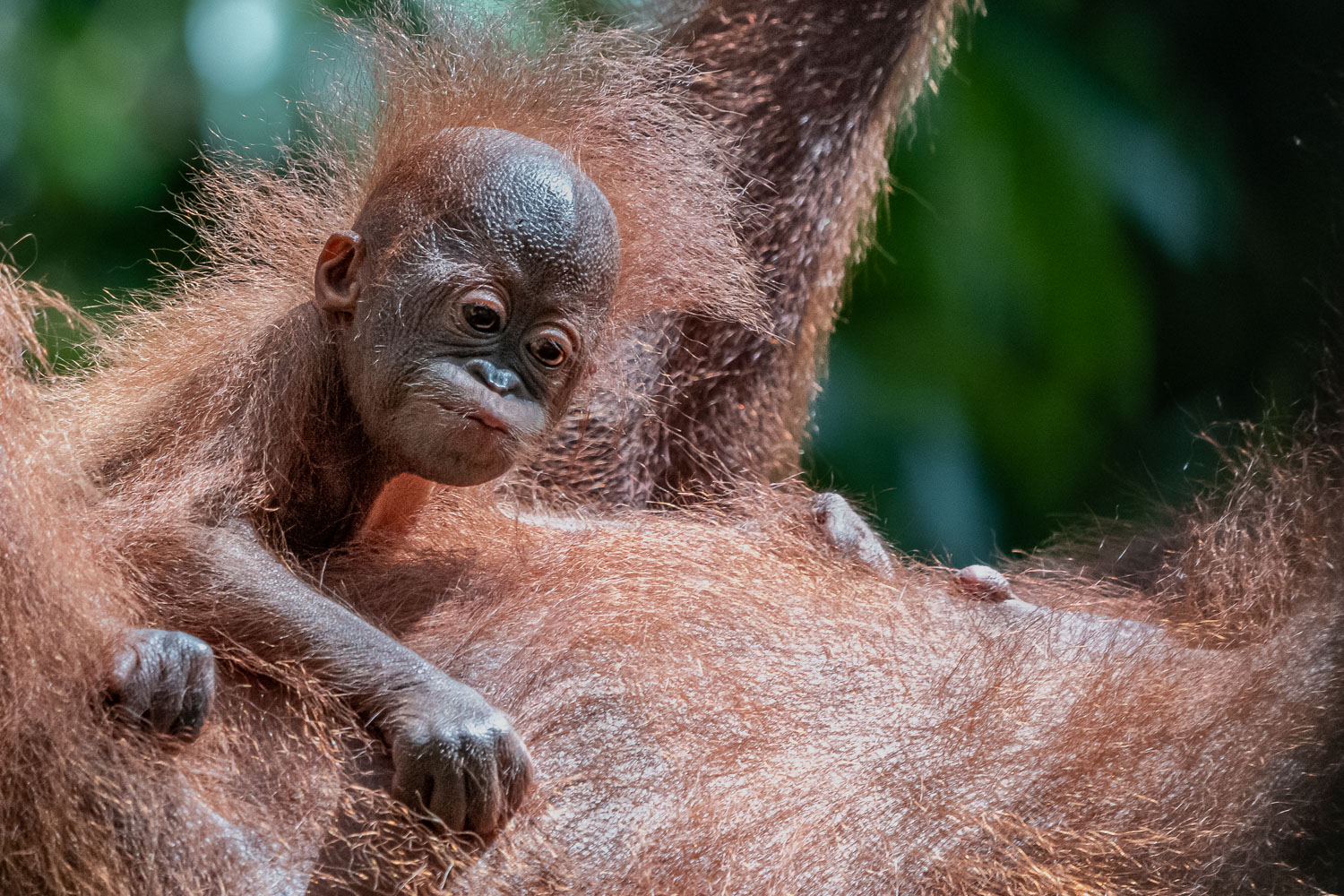 Inmitten des dampfenden Grüns von Borneo, dort, wo das Leben in Schichten aus Licht, Schatten und Atem wohnt, trat sie plötzlich hervor: Eine Orang-Utan-Mutter – still, würdevoll, mit einem kleinen Wesen an ihrer Brust, kaum vier Monate alt.