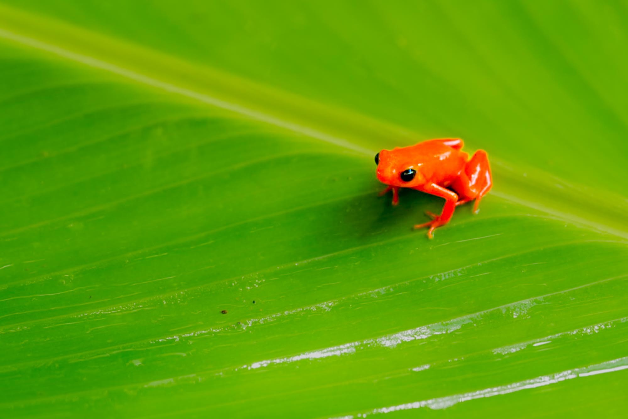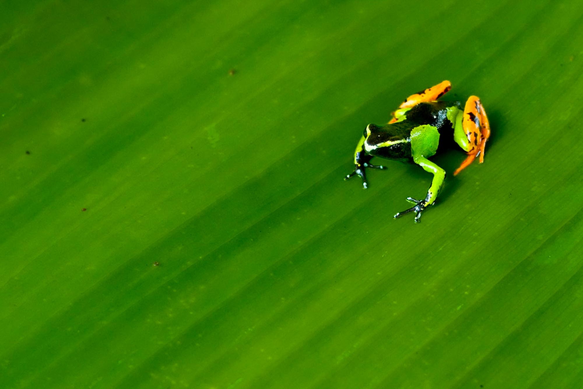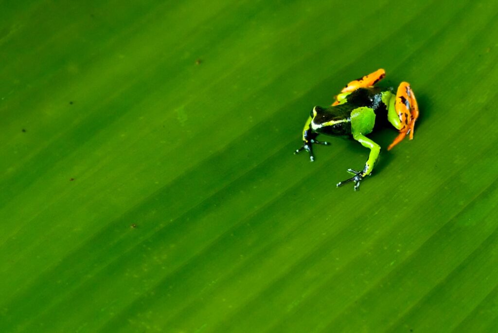 Besonders beeindruckend waren zwei winzige Frösche, die wir ebenfalls abgelichtet haben. Kaum größer als eine Fingerkuppe, vielleicht zwei Zentimeter lang, und doch leuchteten sie in Farben, die im Urwald beinahe unwirklich wirkten. Solch kleine Lebewesen, die dennoch eine so starke Präsenz besitzen, erinnern uns daran, wie reich und überraschend diese Insel ist. Sie zählen zu den Miniaturen des Lebens, aber in ihrer Schönheit stehen sie den großen Tieren in nichts nach.