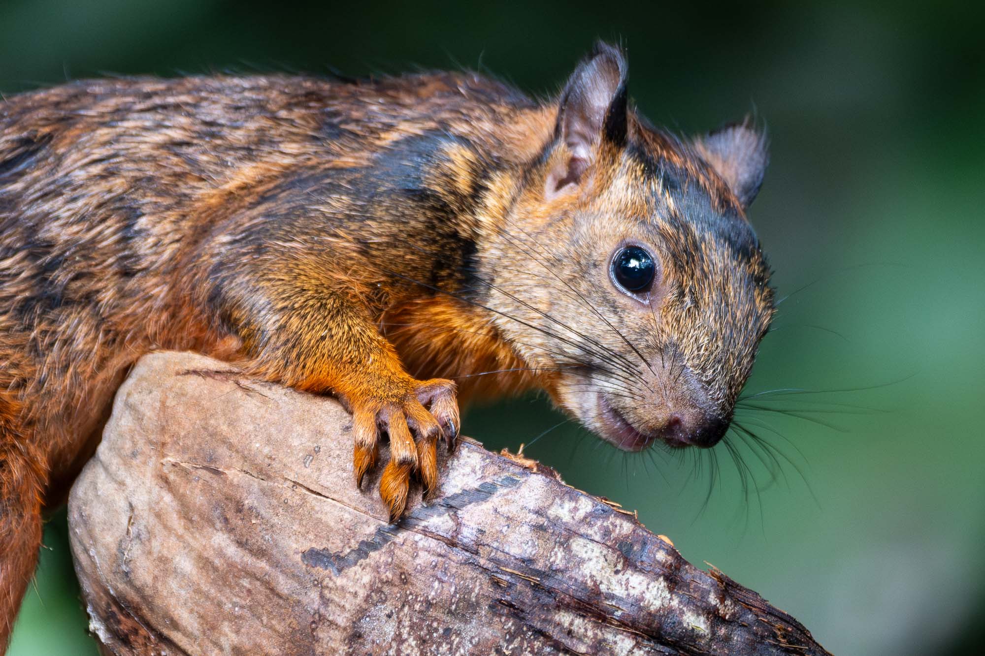 Diese Hörnchen sind wahre Überlebenskünstler und Akrobaten. Der Name „Buntschwanz“ kommt nicht von ungefähr, denn kaum eine andere Säugetierart in Mittelamerika zeigt eine so enorme Vielfalt an Fellfarben. Unser heutiger kleiner Freund präsentierte sich in einem prächtigen Kontrast aus einem warmen Orange am Bauch und einem fast schwarz-braun melierten Rücken – ein perfektes Motiv, um das Spiel von Licht und Schatten im Unterholz einzufangen. Besonders amüsant war es zu beobachten, mit welcher Ausdauer und Geschicklichkeit er sich an einer Kokosnuss zu schaffen machte.