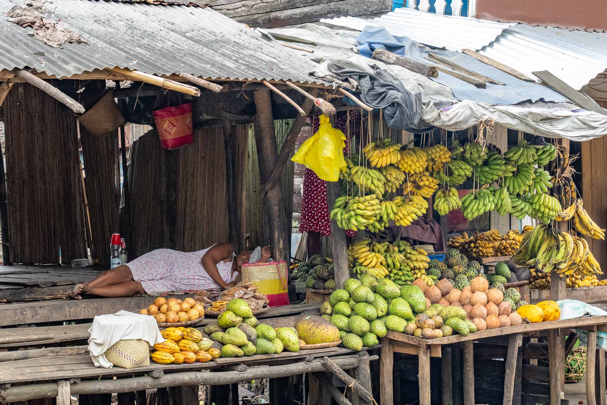 Mehrere Verkäuferinnen liegen gelassen hinter ihren einfachen Ständen, warten geduldig auf Kundschaft und bedienen diese manchmal ebenso entspannt im Liegen. Hier wird nichts forciert. Lebensmittel, Haushaltsgeräte und Kleidung wechseln die Besitzer ohne Hektik, ohne Druck, begleitet von freundlichen Blicken und dem leisen Murmeln des Marktes.