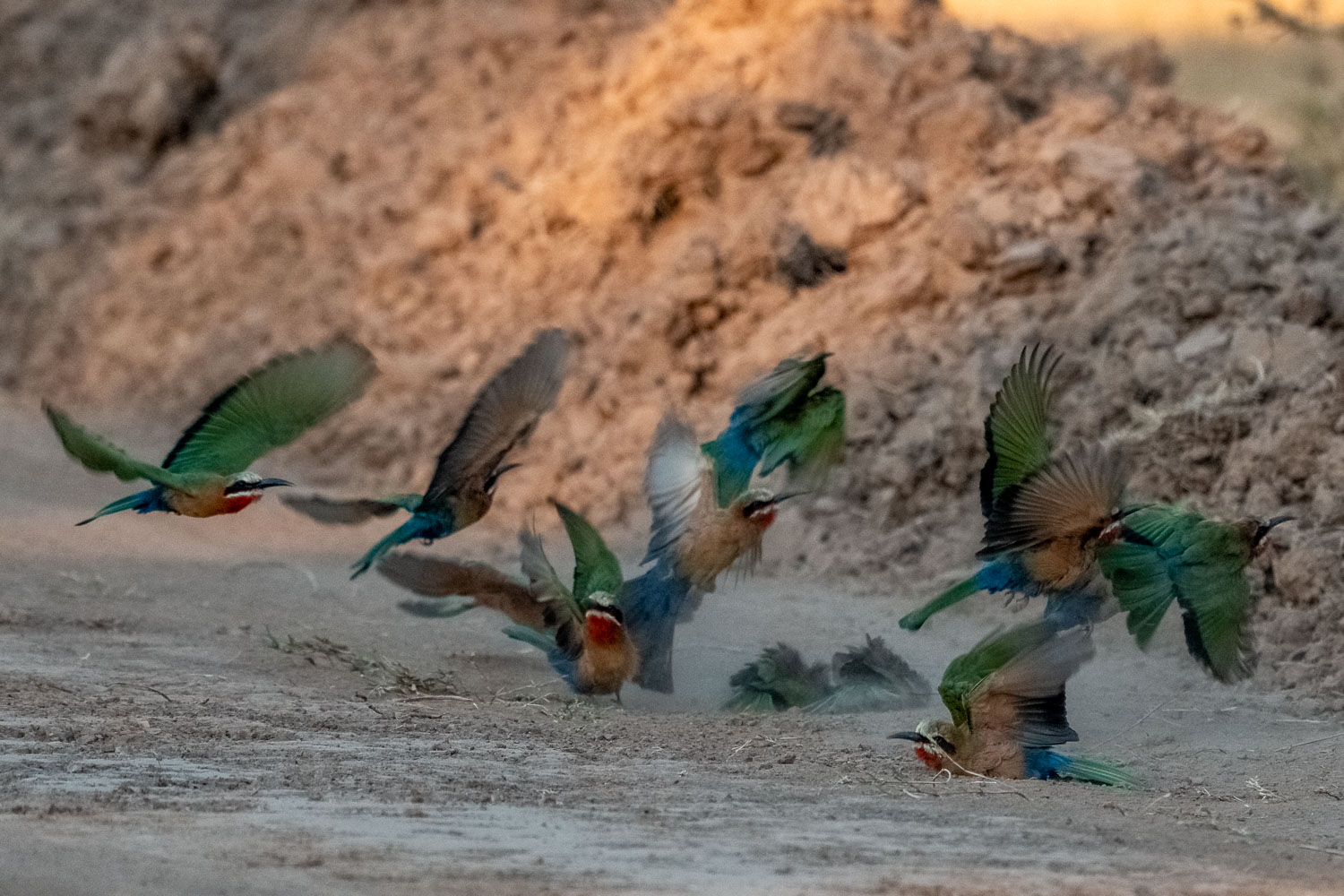 Die Sonne hing tief über der weiten Ebene des South Luangwa Nationalparks, als sich vor unseren Augen ein kleines Wunder entfaltete. Bunte Bienenfresser wirbelten durch den Staub, tanzten im goldenen Licht und schienen für einen Moment alles um sich herum vergessen zu haben. Ihr Gefieder leuchtete wie flüssiger Regenbogenstaub – ein Schauspiel, das uns staunen ließ, als wären wir plötzlich Teil eines lebendigen Gemäldes.