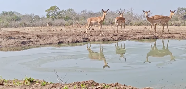 Es kamen einige unterschiedliche Vögel und eine Impalaherde vorbei, um ihren Durst zu stillen .