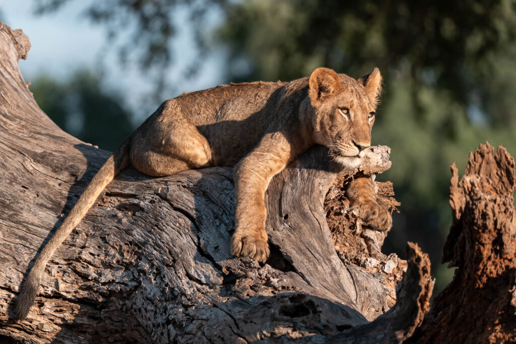 Schon zu Beginn wurden wir von unseren erfahrenen Guides in die Tiefen dieser atemberaubenden Landschaft geführt. Ein unvergesslicher Moment war die Begegnung mit einer Löwenfamilie, die in der goldenen Stunde des Nachmittags direkt vor unserem Fahrzeug einen Impala jagte. Das Schauspiel der Jagd, das uns in seiner ganzen Intensität vor Augen geführt wurde, bleibt für immer in unserer Erinnerung eingebrannt. Wir haben etliche Löwen beim Spielen, sich Raufen, auf einem Baum und bei der Überquerung eines Flusses fotografiert und es war sensationell schön.