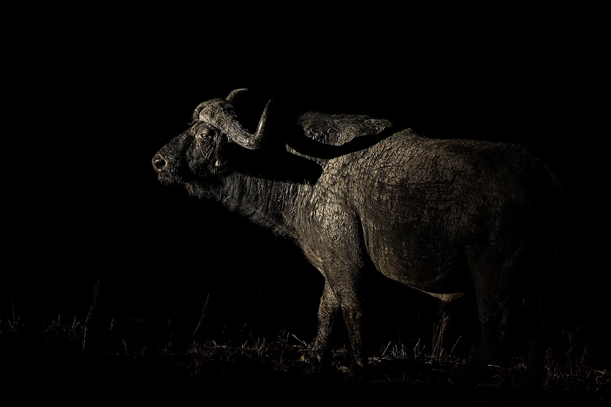 Ein Büffel wurde im Licht einer Taschenlampe auf einer Fotoreise von Benny Rebel in Sambia aufgenommen.